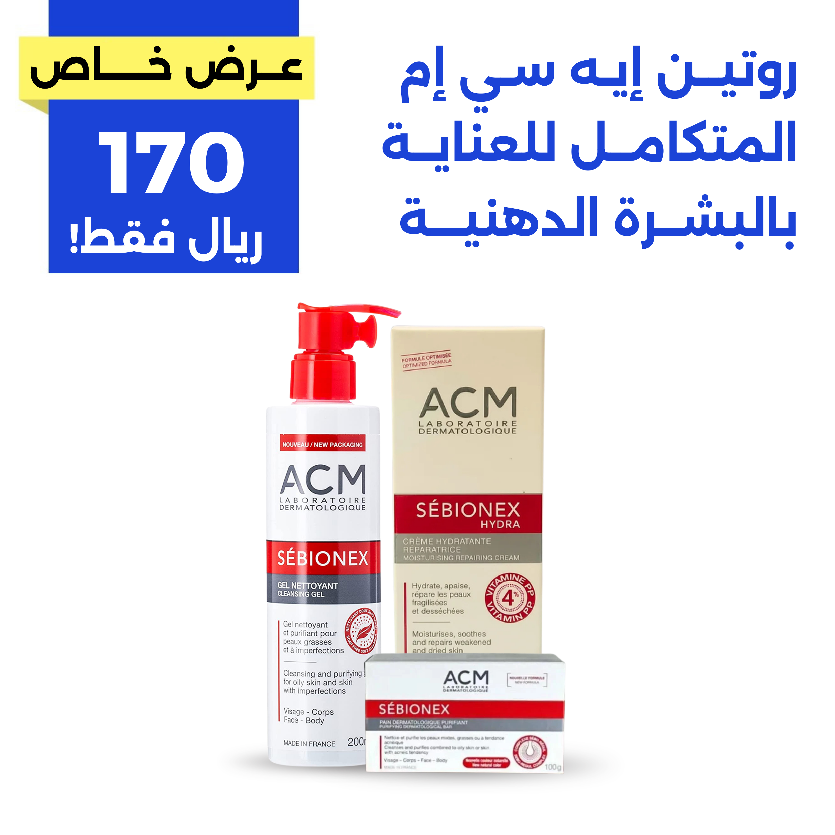 روتين علاجي متكامل من شركة إيه سي إم الفرنسية، مخصص لتنظيف وترطيب البشرة الدهنية والمختلطة، والمساعدة في الحد من الحبوب واللمعان الزائد.