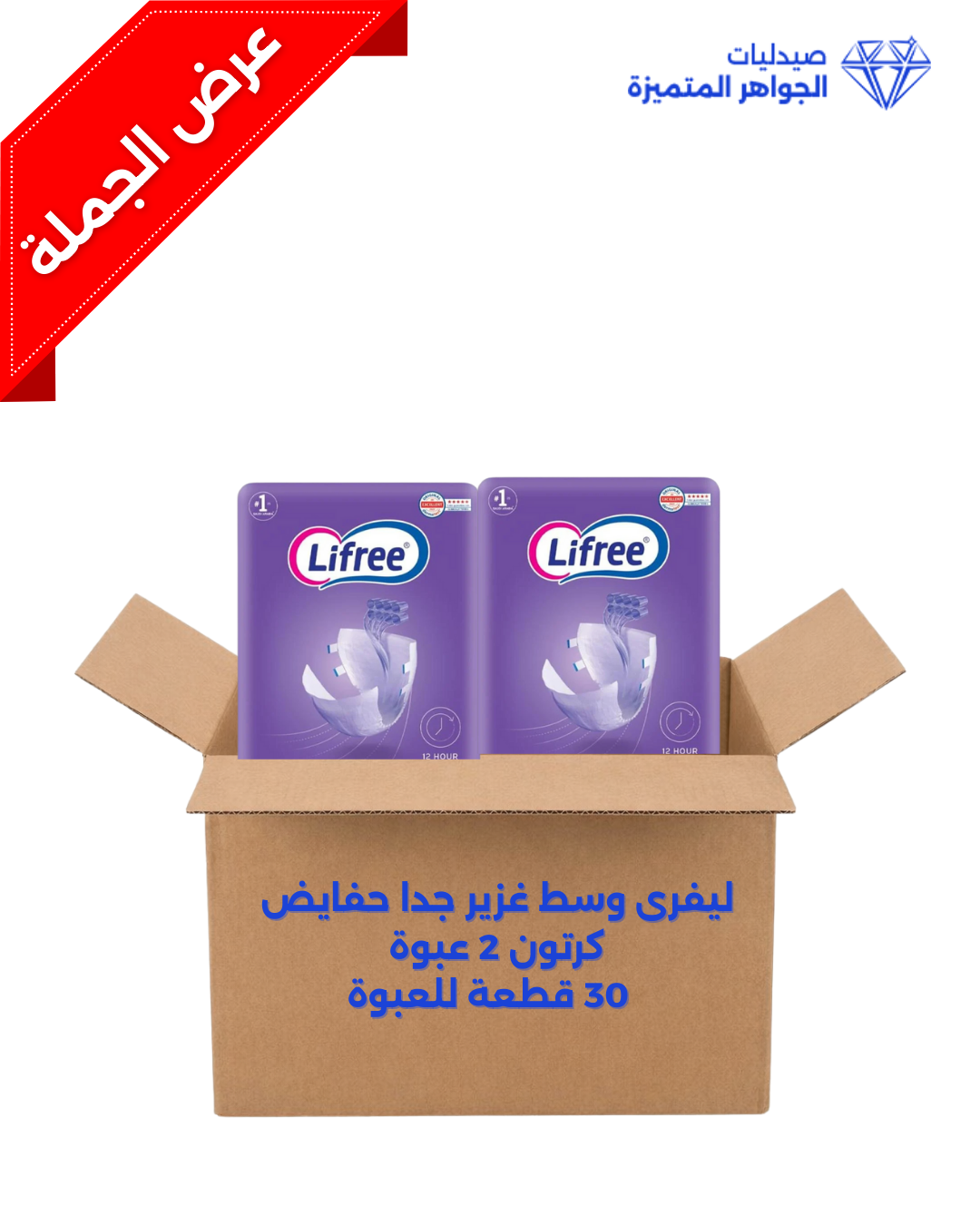 حفاضات لايفري مقاس متوسط (ميديام) بدرجة امتصاص فائقة (غزير جدا)، مصممة لتوفير حماية قصوى ضد التسرب مع امتصاص عالٍ يدوم لفترات طويلة.